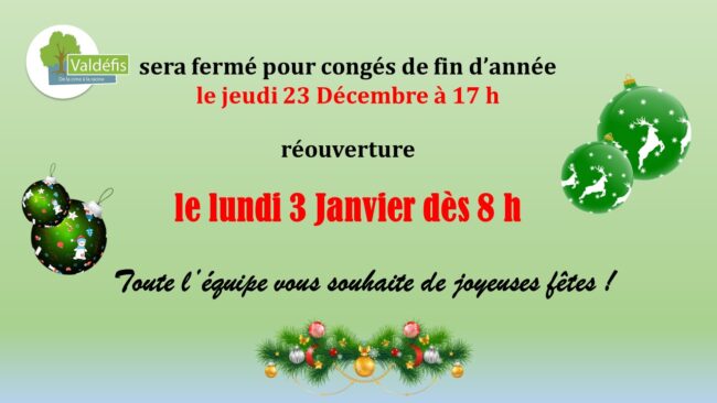 Notre équipe prendra quelques jours de congés, du: mardi 22 décembre à 17 h pour mieux vous accueillir le: lundi 4 janvier 2021 à 8 h Bonnes fêtes de fin d’année!!
