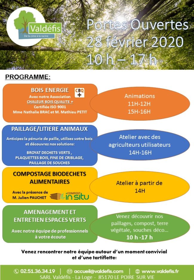 En ces temps forts troublés, Valdéfis continue ses activités et accueille les PROFESSIONNELS aux horaires habituels: 8h-12h30 et 14h-17h. COMPOST TERRE VEGETALE PAILLAGE PEUPLIER PAILLAGE CHENE PAILLAGE MELANGE BOCAGER PAILLAGE RESINEUX PAILLAGE FINE DE CRIBLAGE DEPOT DECHETS VERTS DEPOT SOUCHES DEPOT PALETTES – GRATUIT DEPOT GRUMES/BILLES DE BOIS (SUPERIEUR à 2 m de long) –…