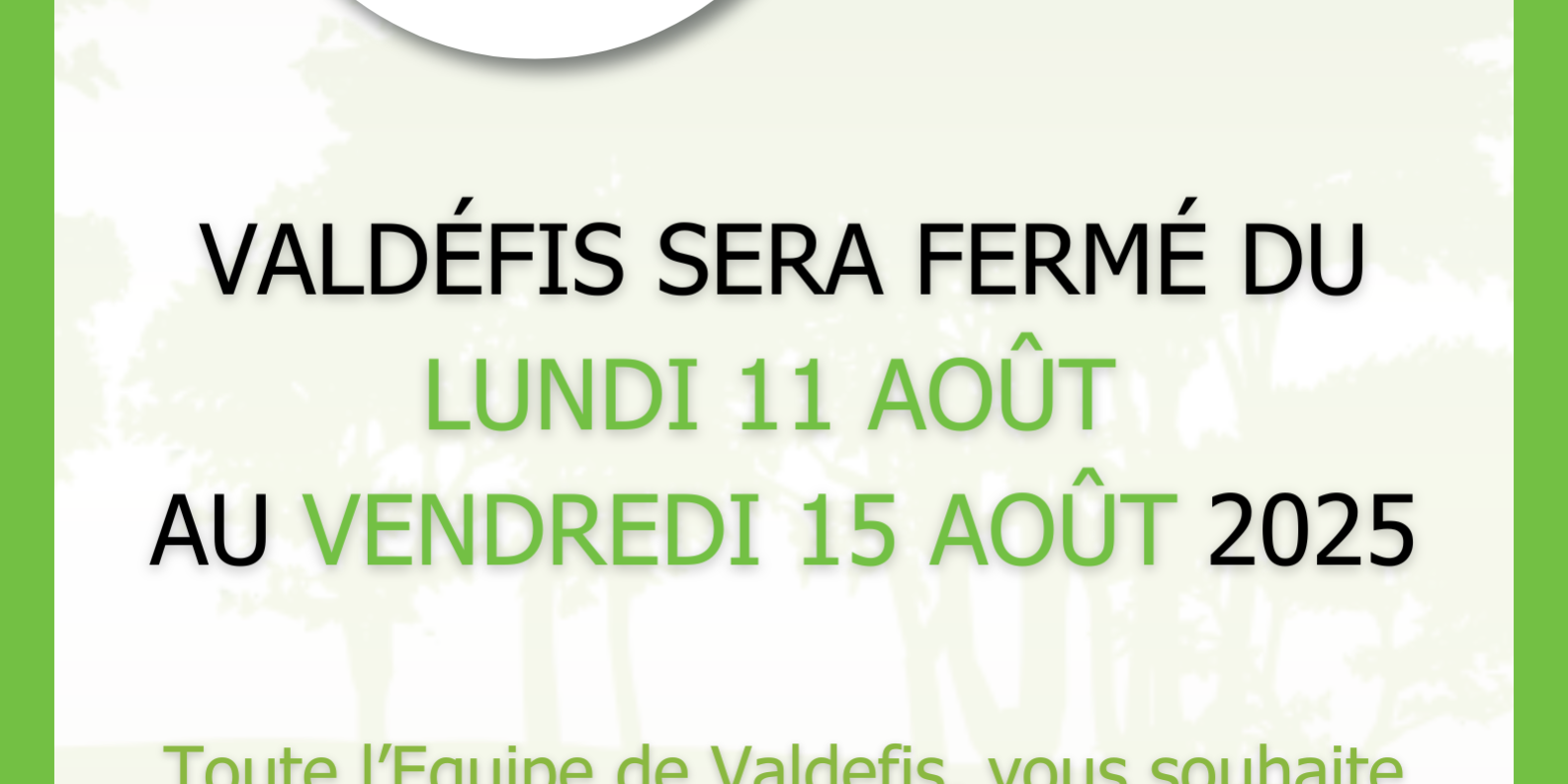 Valdéfis sera fermé à compter du vendredi 08 Août au soir jusqu’au vendredi 15 Aôut inclus. Réouverture le lundi 18 Août dès 8h.